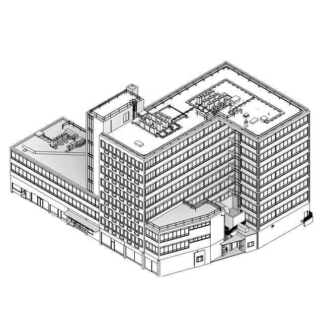 GIS-Point was engaged to update the digital documentation of an existing multi-storey commercial building following significant changes since the previous survey conducted in 2012. The project involved processing newly acquired point cloud data and developing an accurate LOD300 BIM model covering the basement, ground floor, and seven upper levels. The scope included modeling structural elements, architectural components, and visible building services, as well as generating coordinated 2D CAD drawings including floor plans, elevations, and sections at 1:50 scale. The resulting BIM model provides an up-to-date digital representation of the building to support the client’s planning and design process.