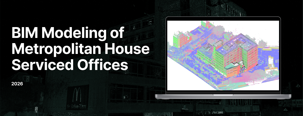 The project involved processing newly acquired point cloud data and developing an accurate LOD300 BIM model covering the basement, ground floor, and seven upper levels.